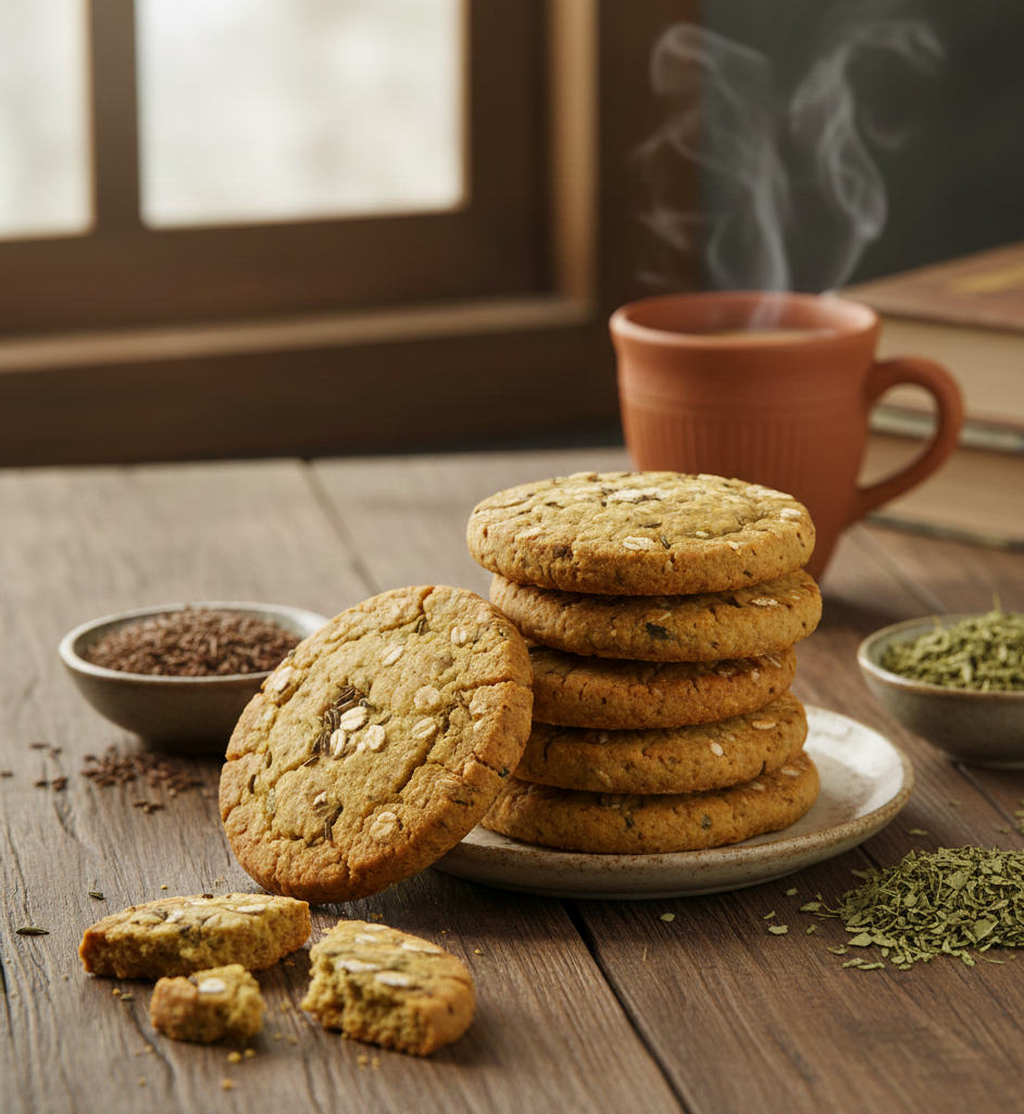 Crisp, savoury cookies made with jowar, ragi, oats, besan, jeera, and kasuri methi – no maida, no wheat flour, and no refined sugar. Great as a tea snack or office munchies.
