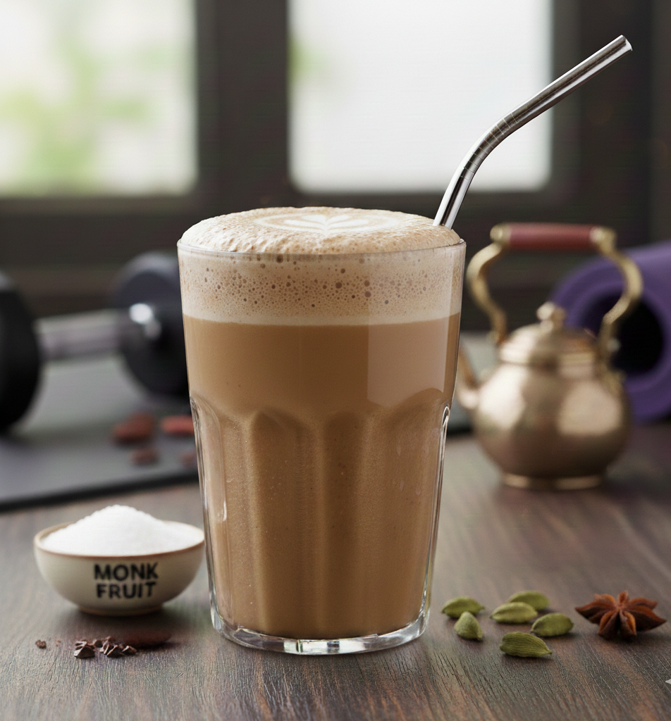 Hyderabadi Irani chai meets protein shake. Strong tea decoction, a hint of cocoa, monk fruit, and whey – comfort flavour with gym-friendly macros.
