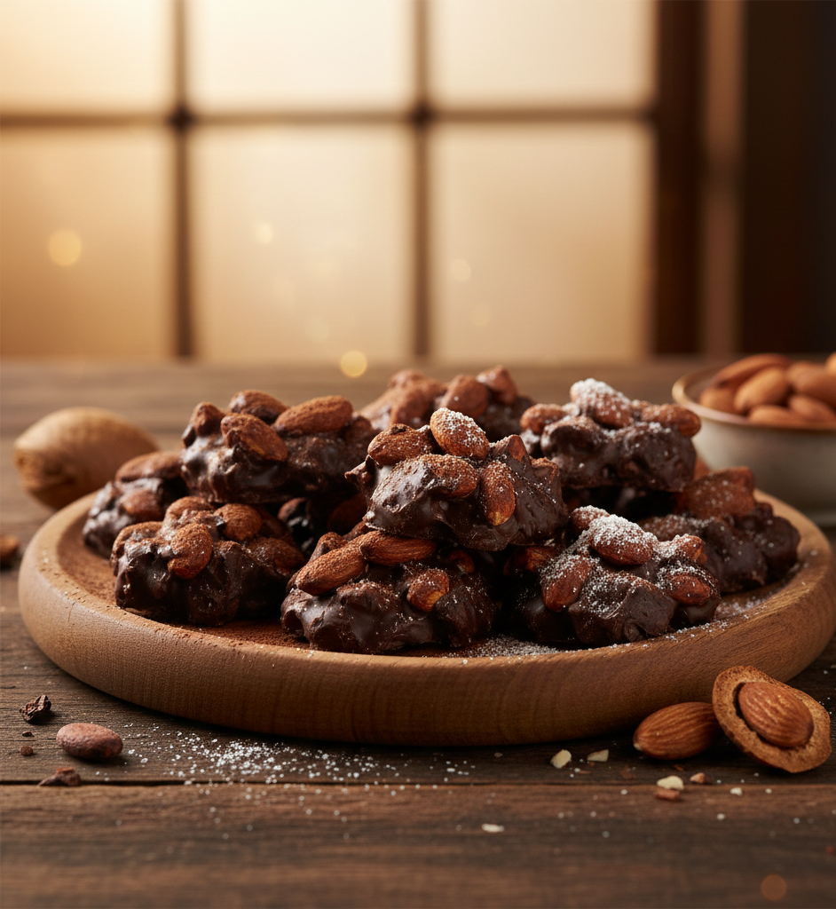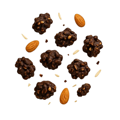 Crunchy roasted almonds coated in a rich chocolate shell made with cocoa, cocoa butter, monk fruit, and milk powder. No compound chocolate, no sugar, no preservatives.