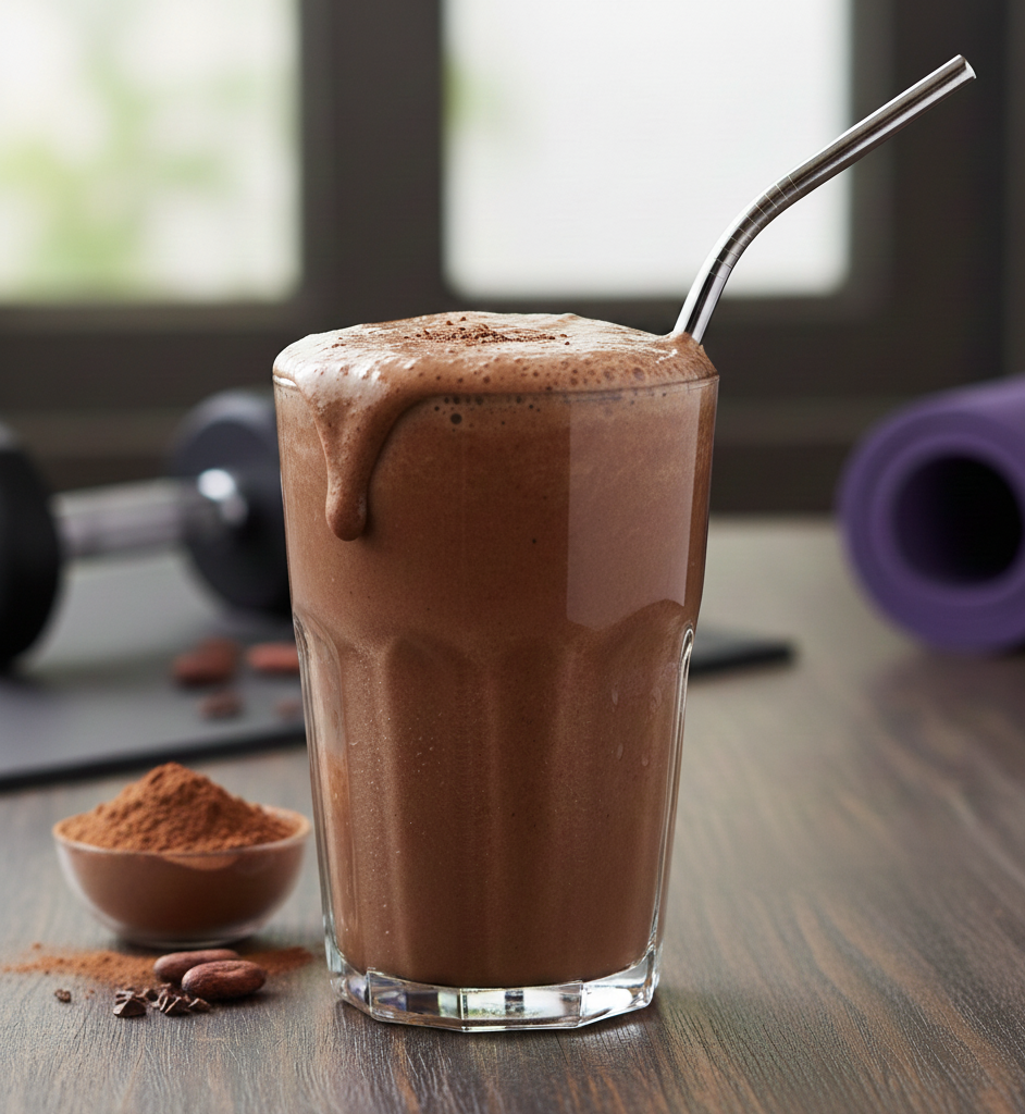 A thick, creamy chocolate protein shake built on whey, cold milk, and cocoa – no sugar, no jaggery, no nonsense. Perfect as a post-workout shake or a high-protein breakfast.