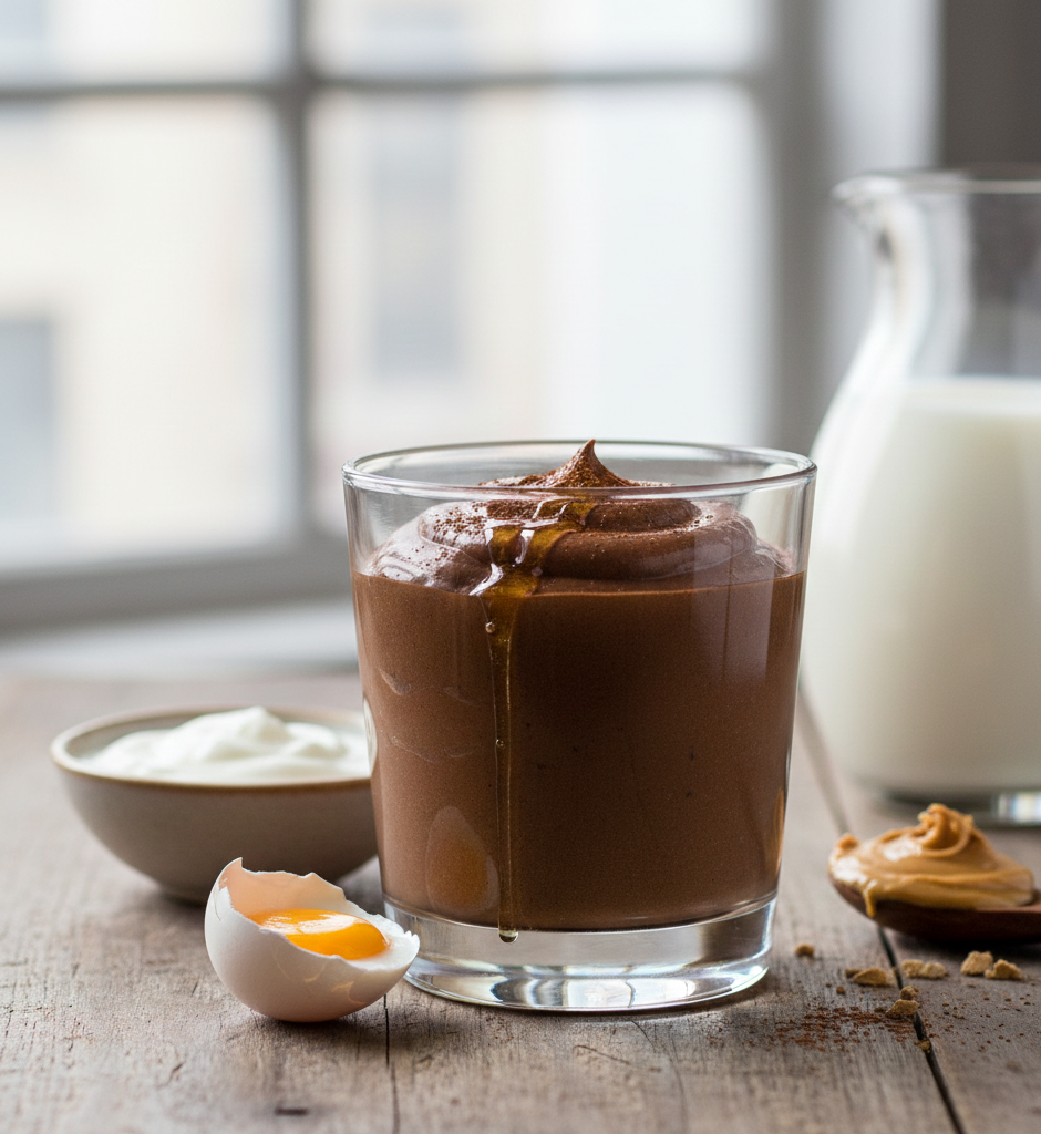 A rich, spoonable chocolate mousse built on boiled eggs, milk, cocoa, Greek yogurt, and honey – high in protein, with real ingredients and no cream or sugar syrups.