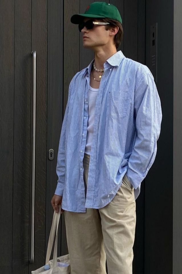 - Looser fitting linen shirts are a great choice, especially in powder blue or striped.
