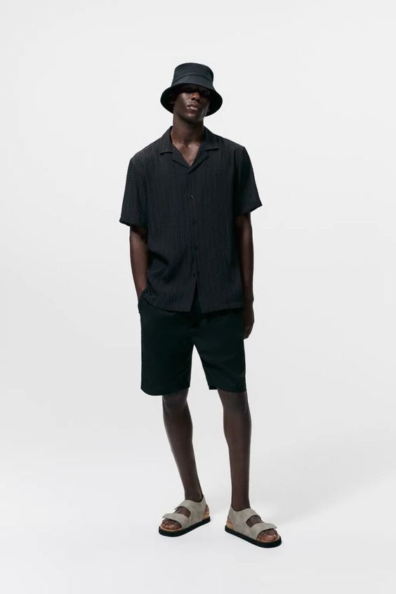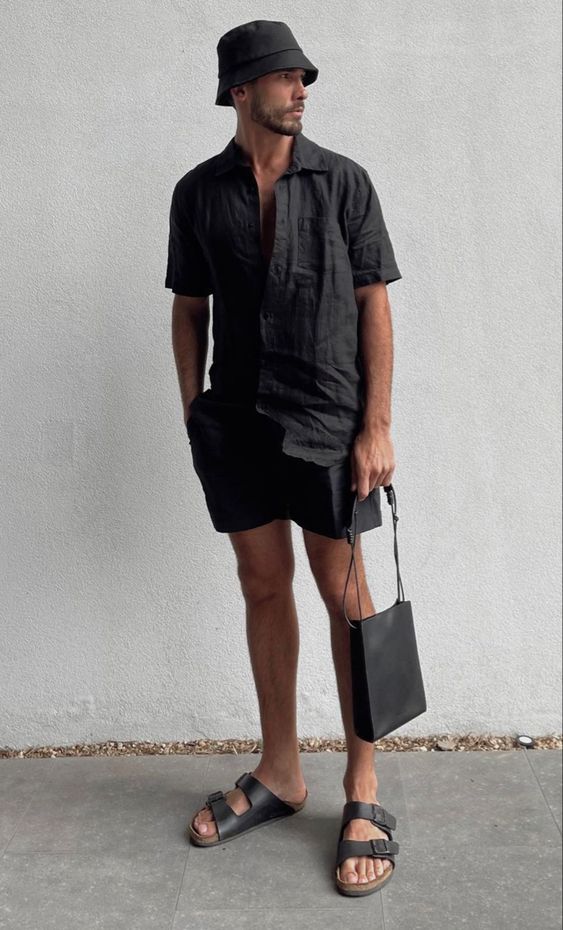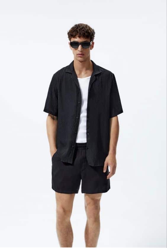 Go relaxed on top: Oversized or boxy black T-shirts, open short-sleeve shirts, or textured Cuban collars. Linen, seersucker, and breathable cotton are your best friends.