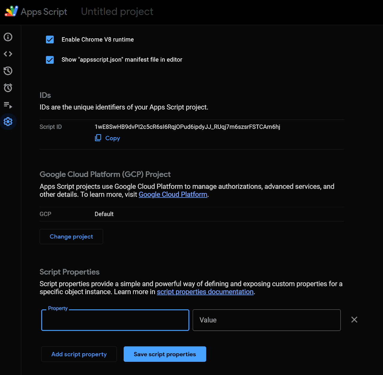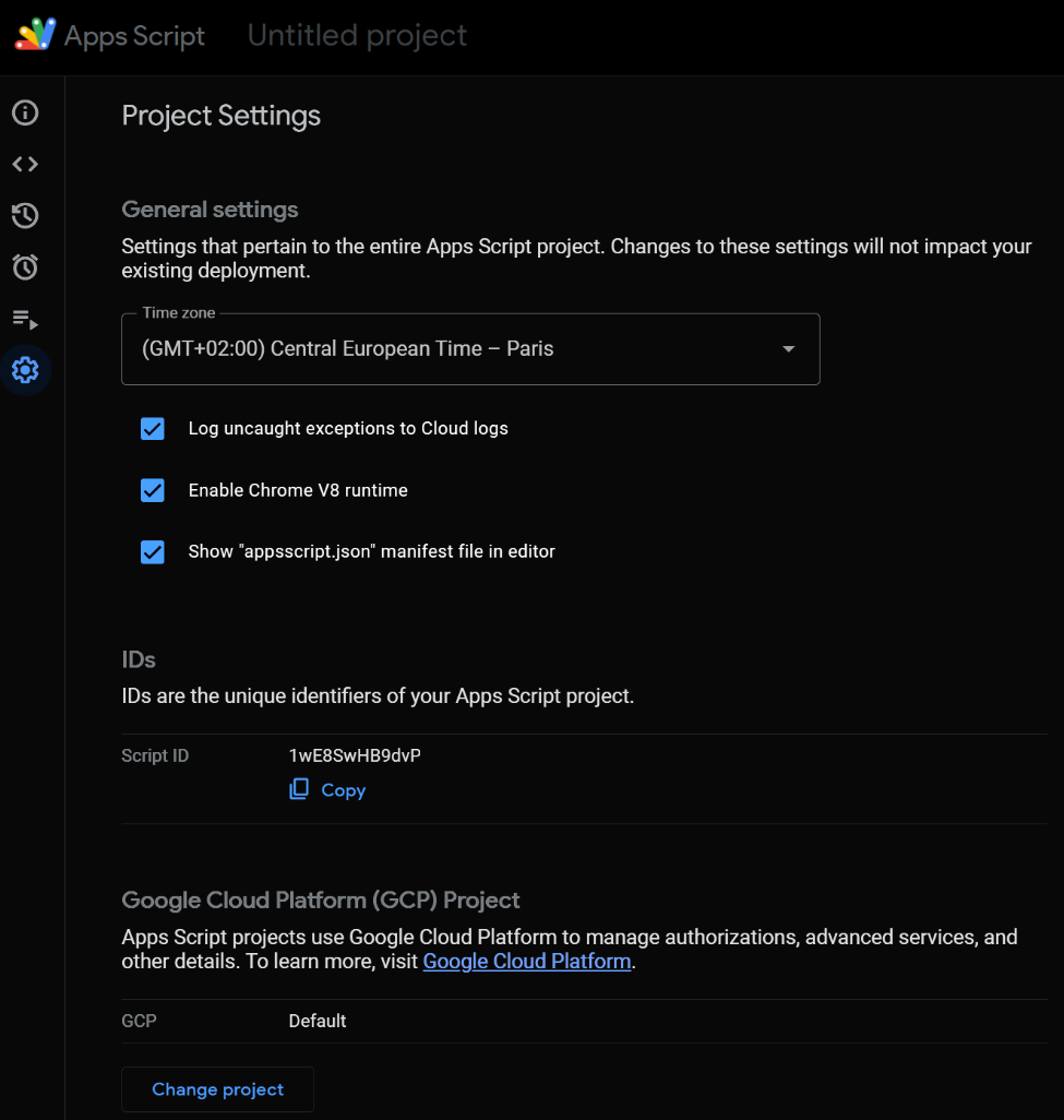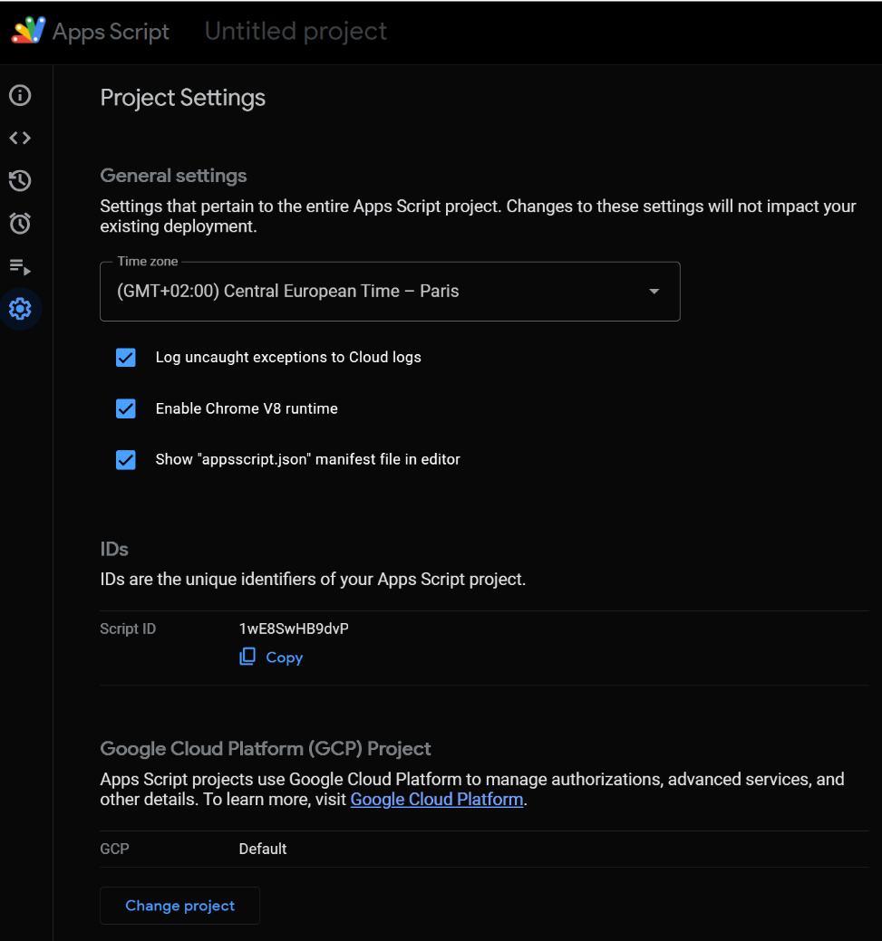 IDs section – See your Script ID and your Google Cloud Project ID, both useful when linking APIs, deployments, or enabling advanced services.